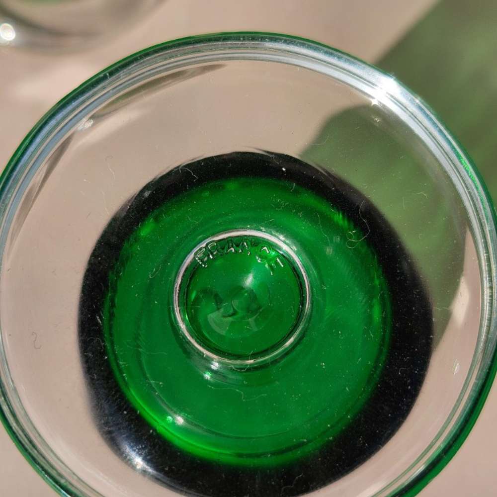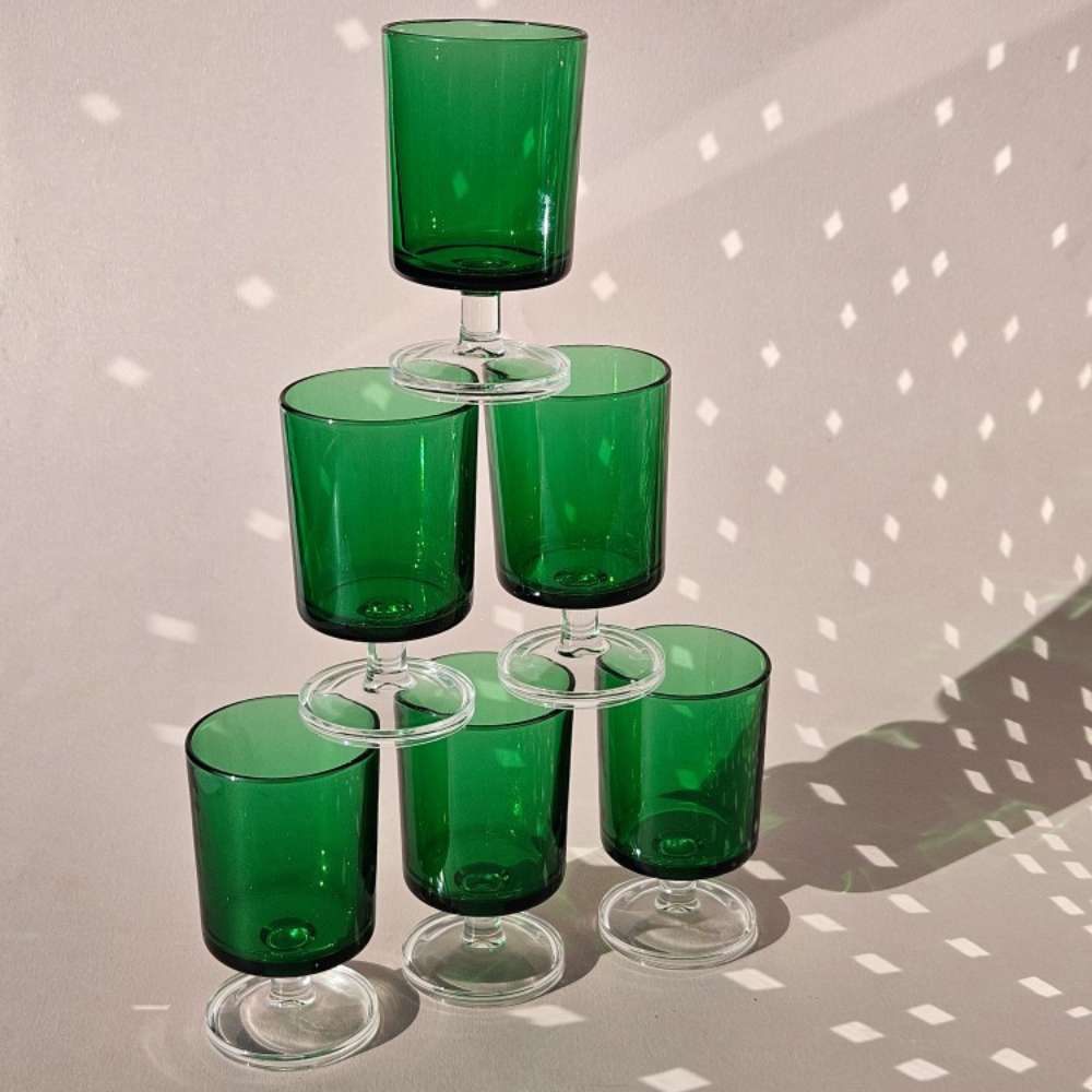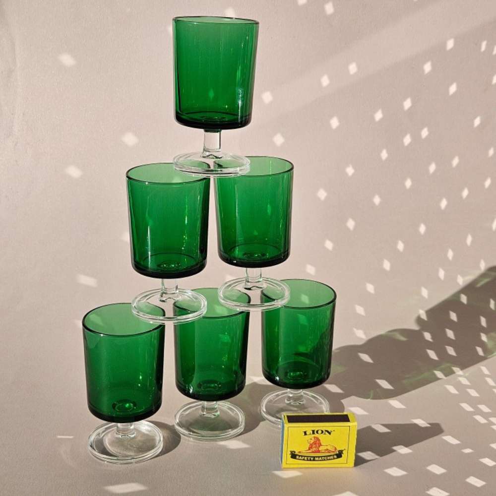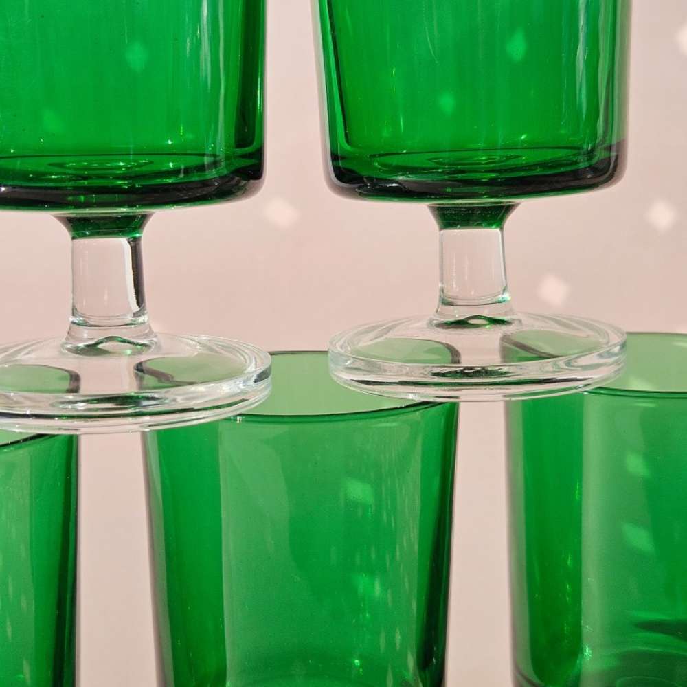 Elevate your spread with an awesone set of six 60’s Arcoroc clear stemmed emeral green glasses.