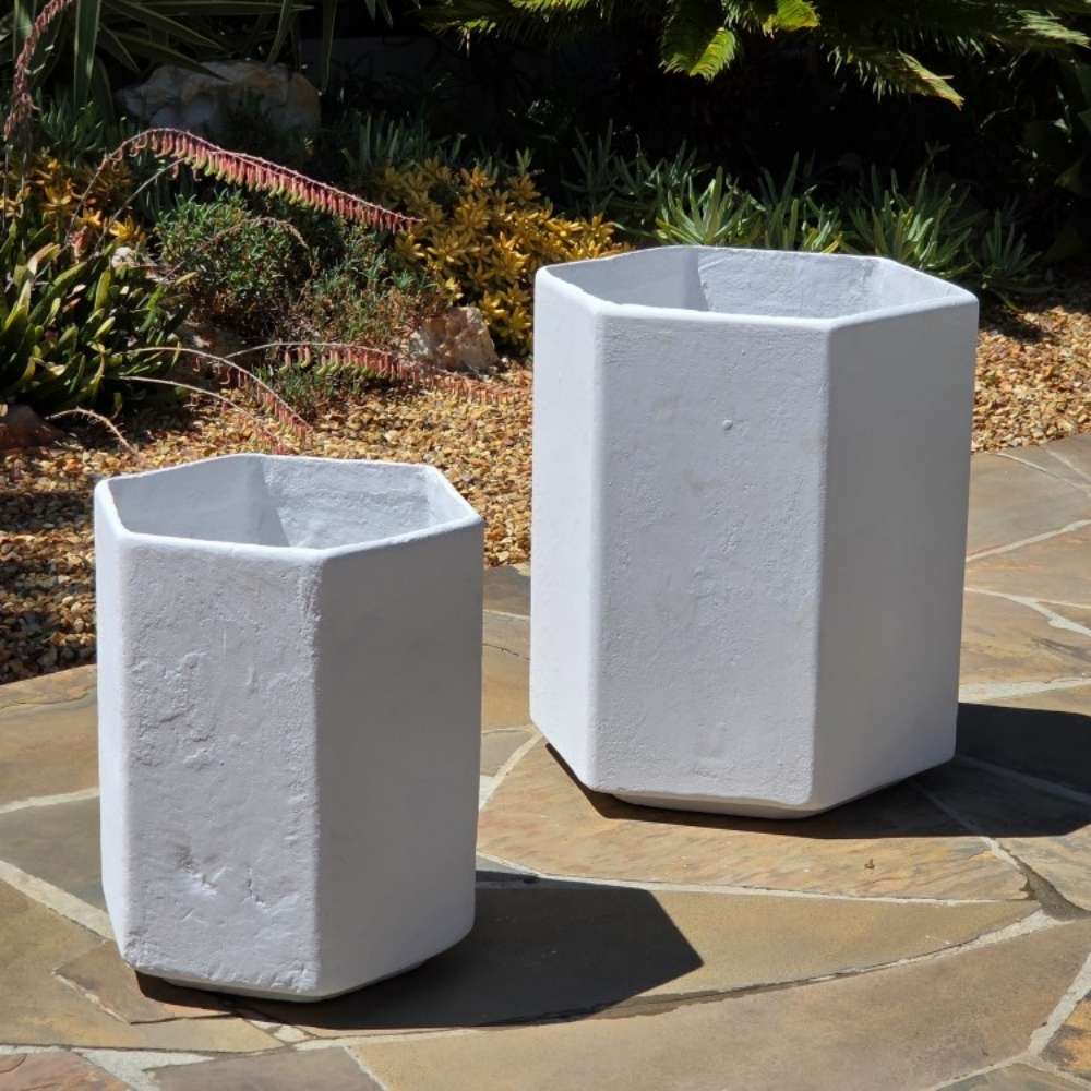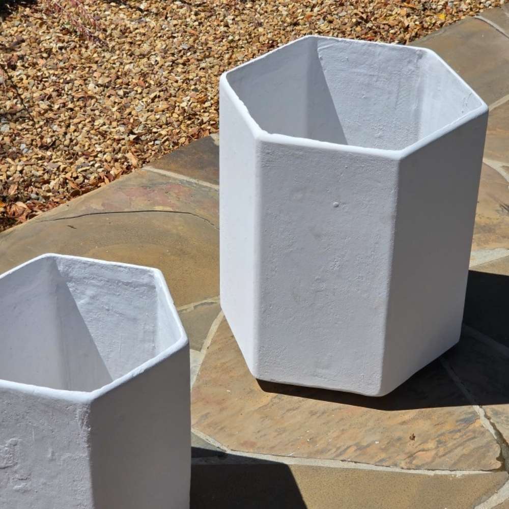 A striking pair of vintage Everite hexagonal planters — minimalist, angular, and beautifully architectural. Their clean geometry and matte white finish make them perfect for adding structure and contrast to any garden or modern interior.