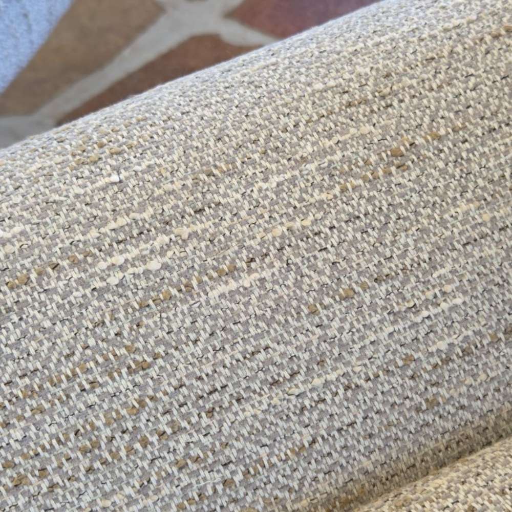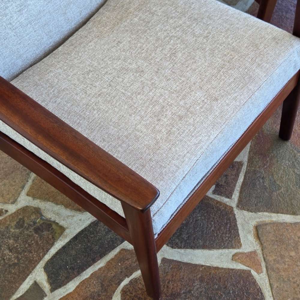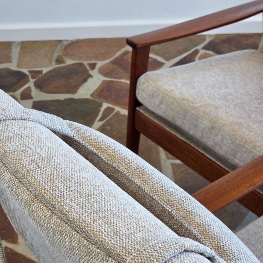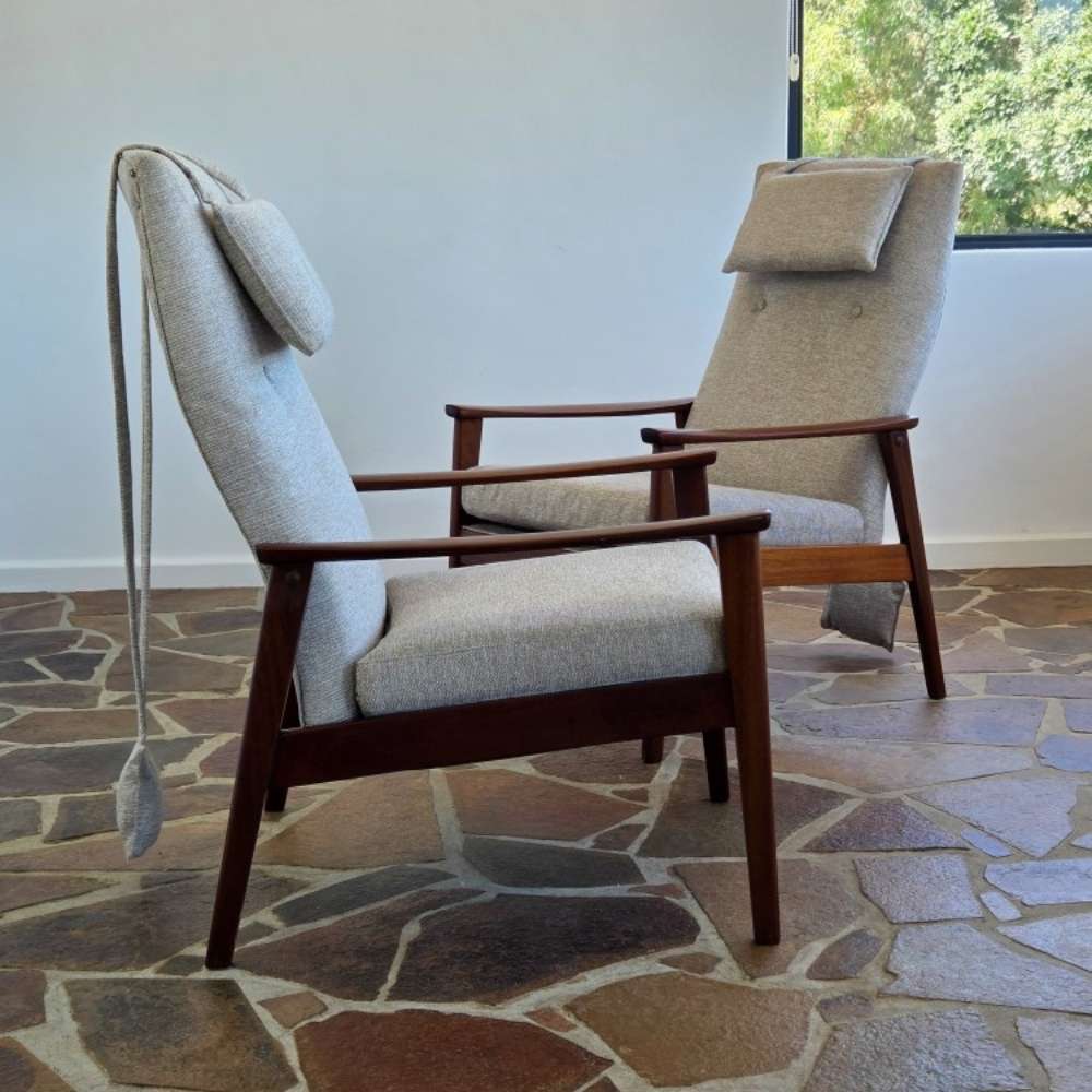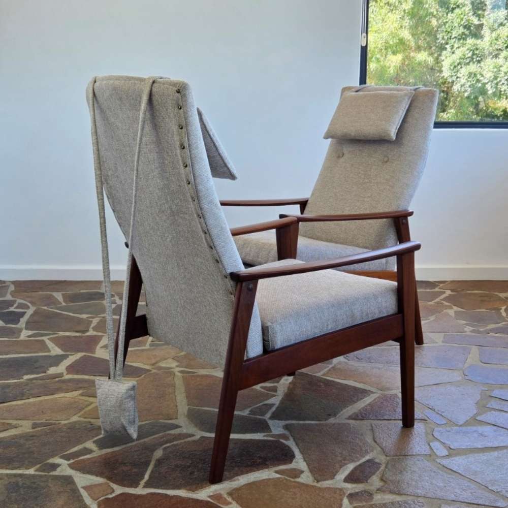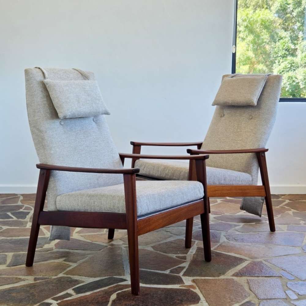 Both chairs have been newly upholstered in a linen-toned textured fabric, giving them a soft, contemporary feel while keeping the original character intact. The highbacks and loose head cushions add comfort and presence, making them ideal for a living room, reading corner, or a calm architectural moment in a space.