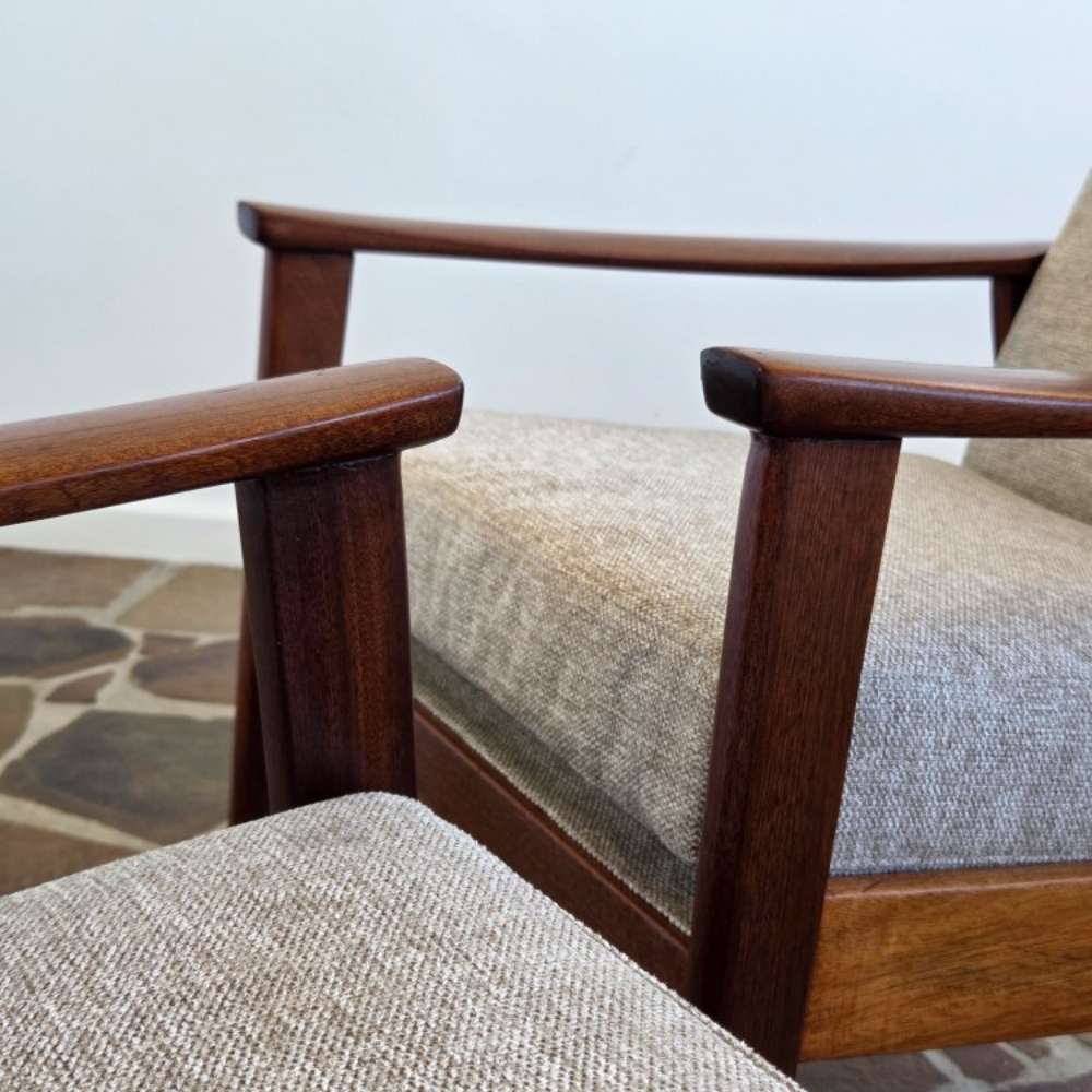 A beautifully restored pair of Parker Knoll highbacks, showcasing that classic mid-century British silhouette Parker Knoll mastered so well. The frames are crisp and freshly refinished, with the timber showing a deep, even tone that complements the geometry of the design.