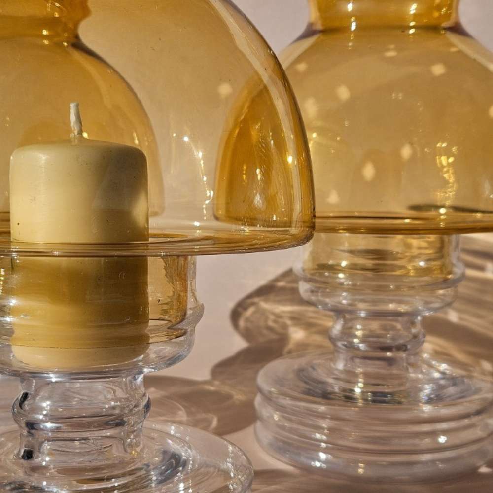 Each lamp features a clear, stepped base supporting a vibrant amber glass shade, creating a warm, diffused glow reminiscent of celestial bodies. Rarely found as a complete trio, this set offers a unique opportunity to own a cohesive collection of Still’s iconic work.