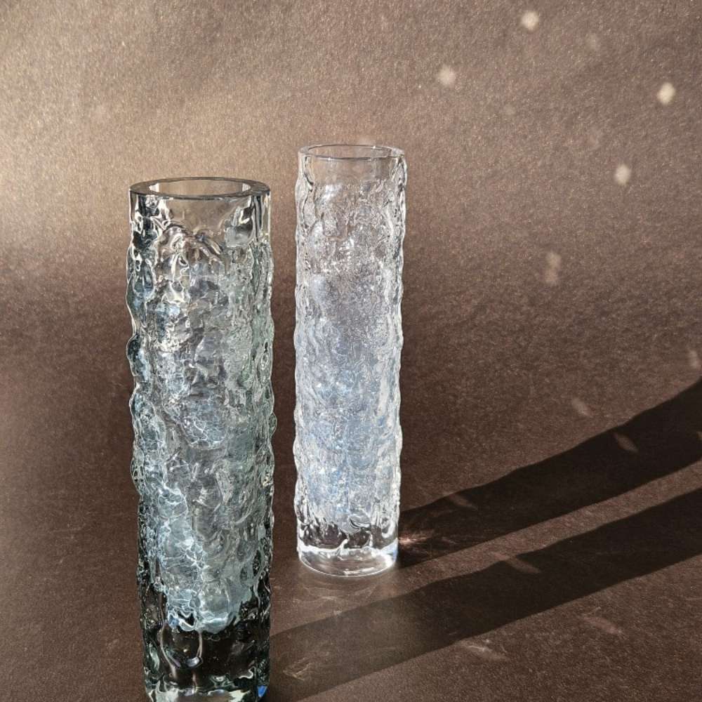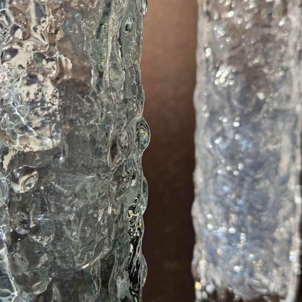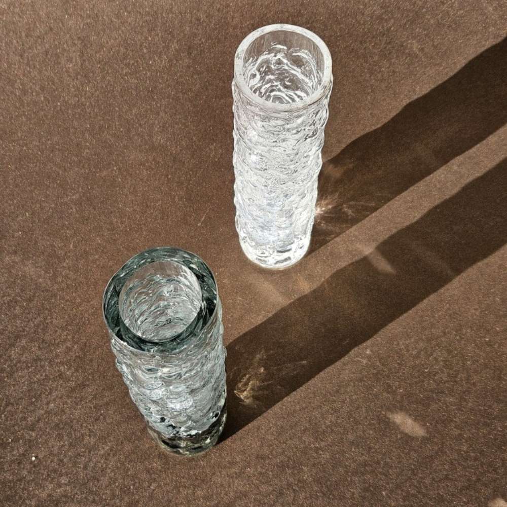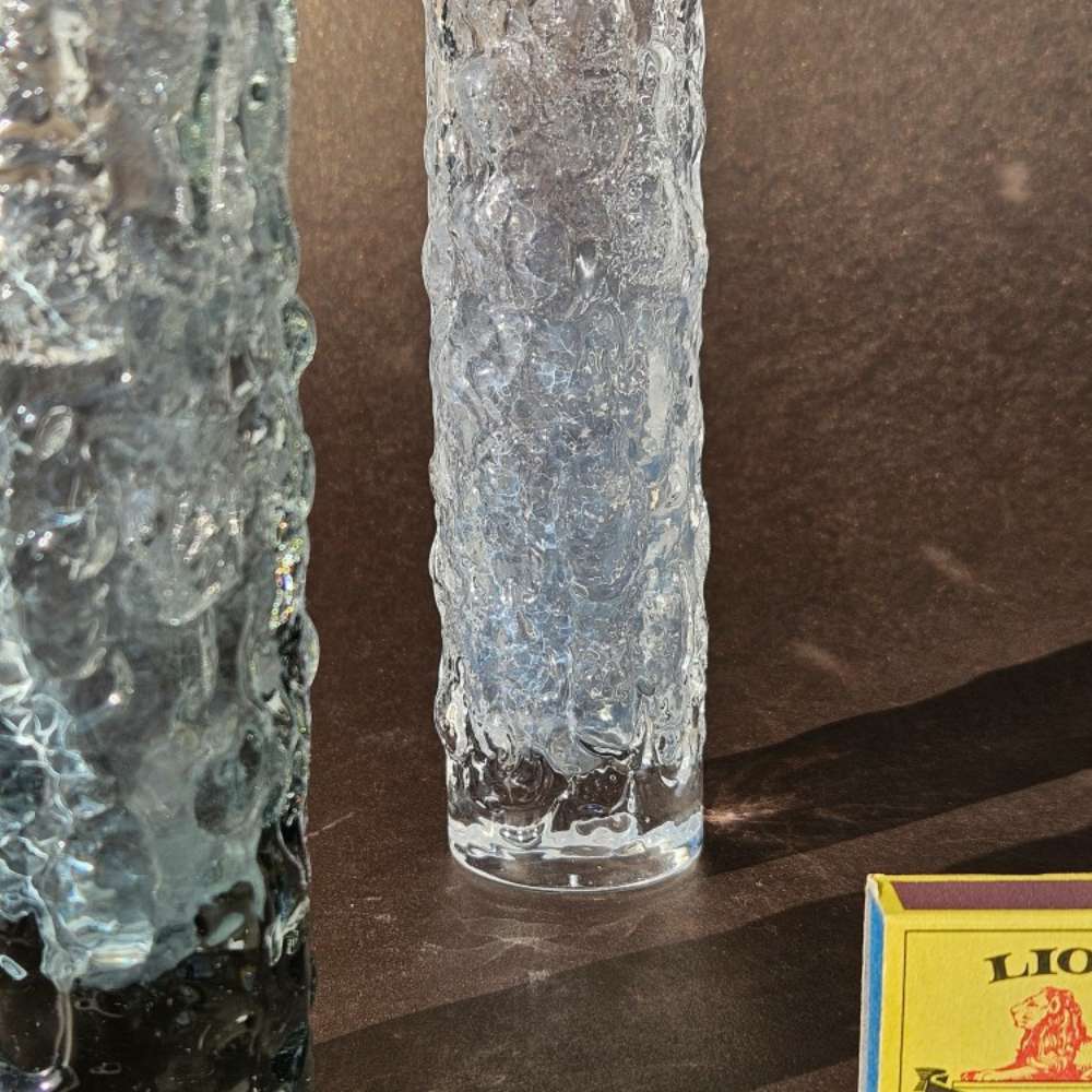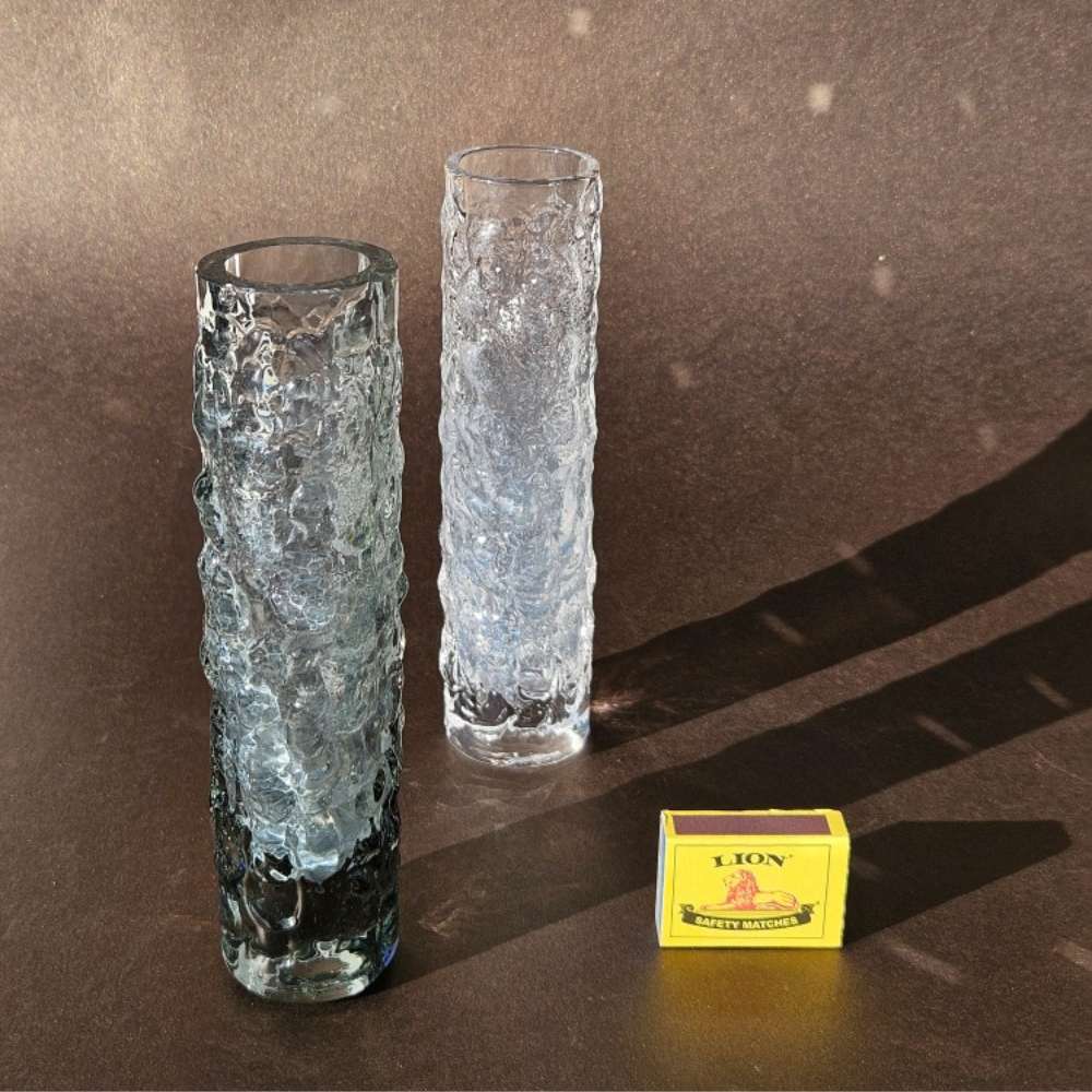 Designed by Geoffrey Baxter, these cylindrical vases feature the iconic bark finish — a tactile, organic texture that became synonymous with British art glass in the late ’60s.